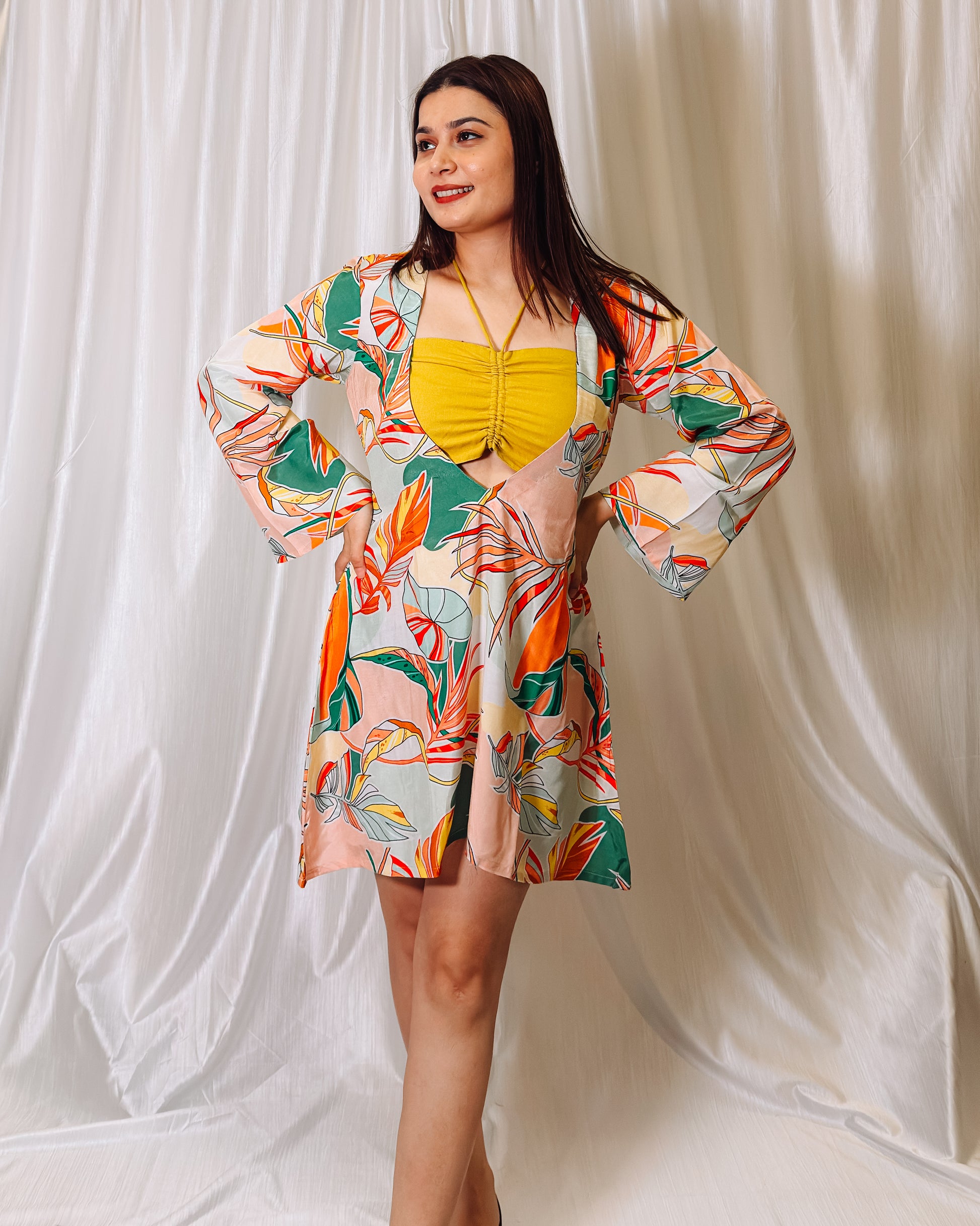 Breezy, floral, and effortlessly chic — this short, loose-fit bustier dress is your perfect vacation companion. Designed for comfort, style, and sun-kissed getaways.