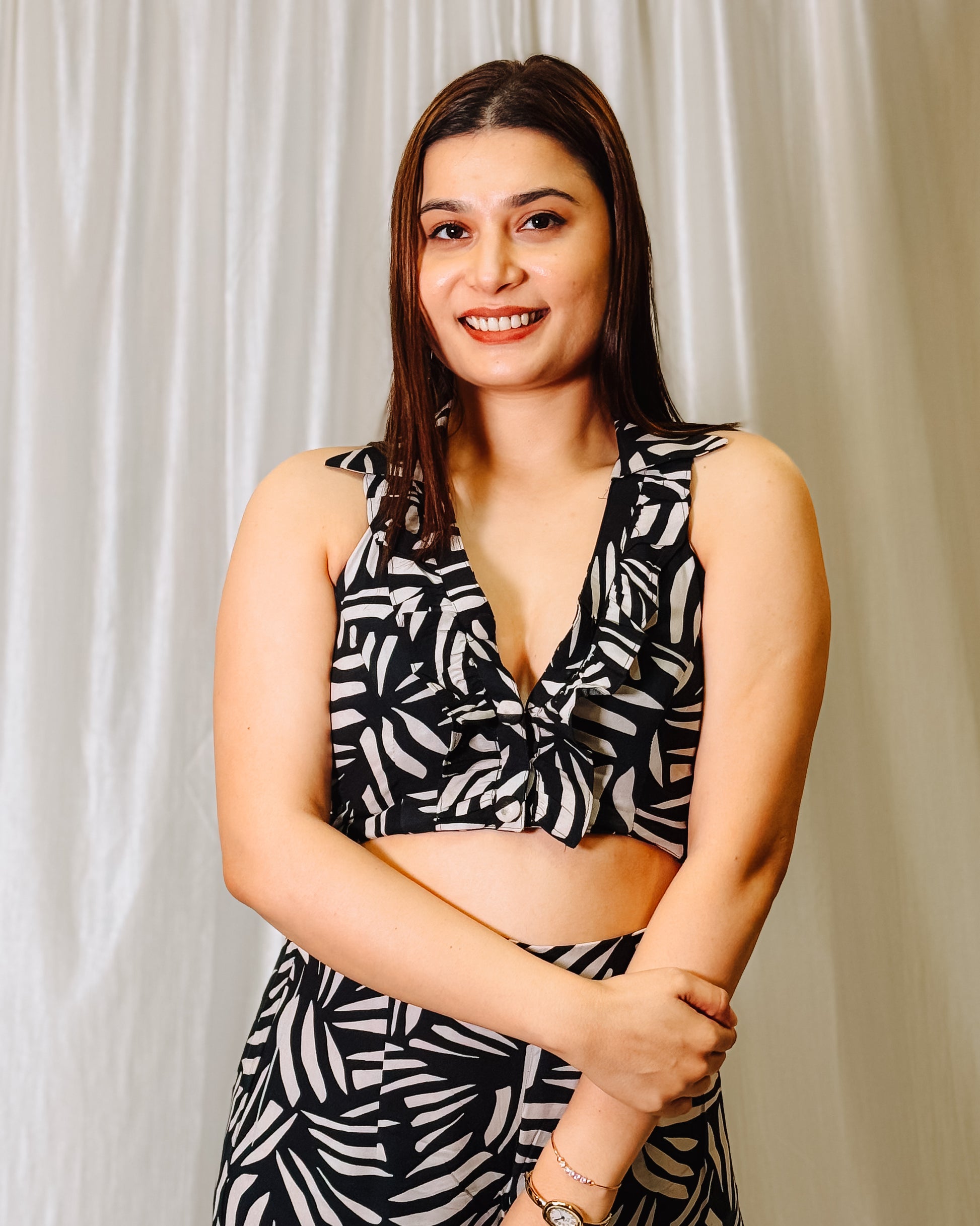 This black and white printed co-ord set features a sleek crop top with delicate neck detailing, paired with tailored pants for a contemporary look that transitions seamlessly from brunch to evening events.