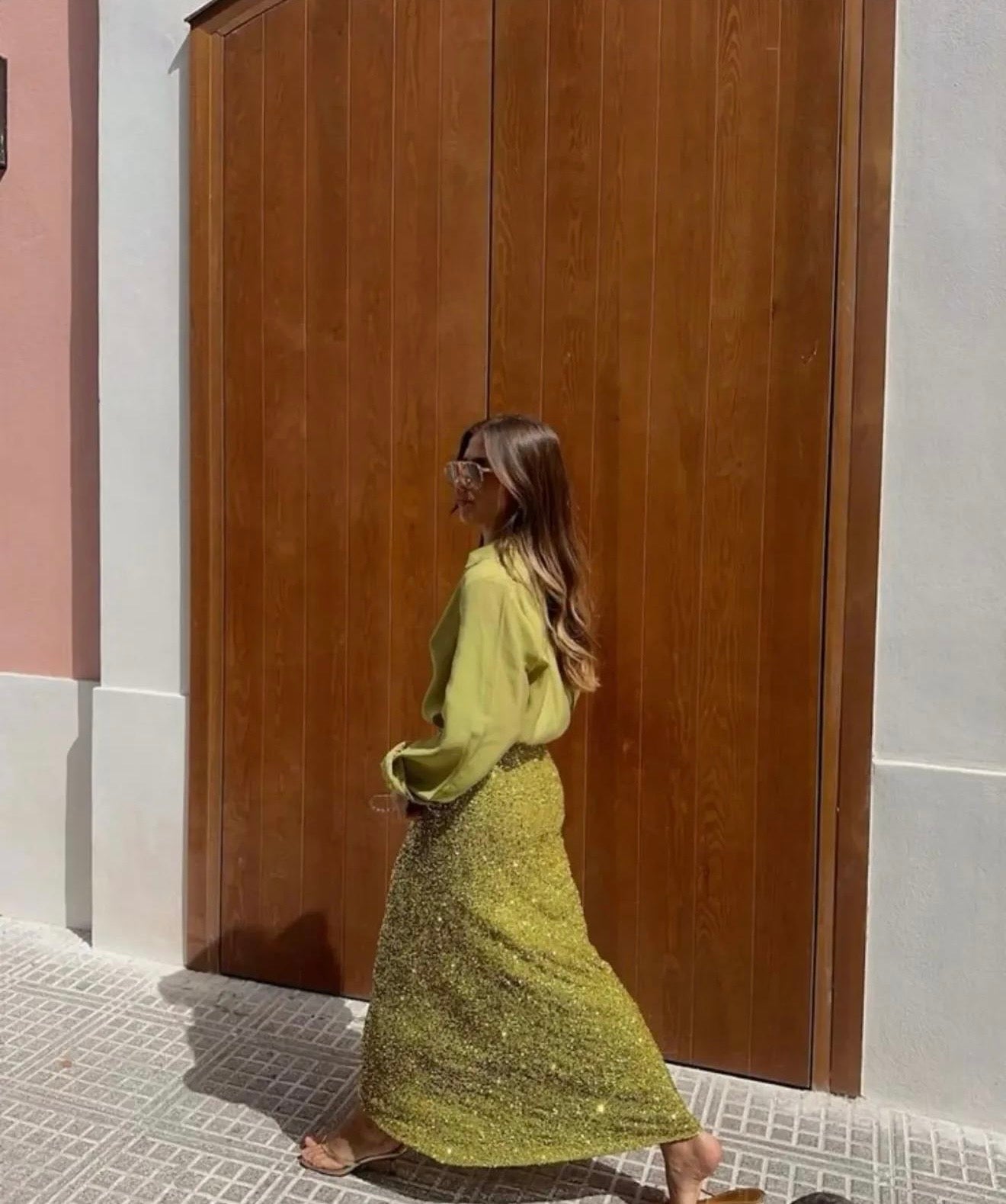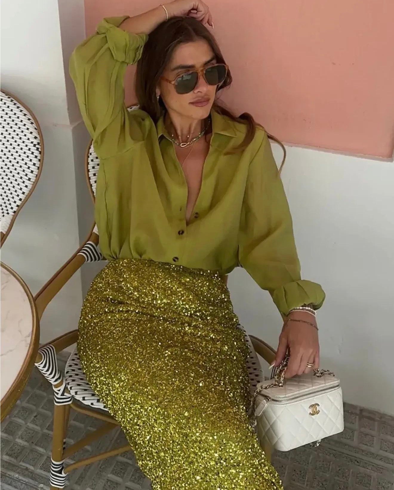 Shine through the season with this chic shimmer skirt paired with a sleek shirt — the perfect blend of classy and festive. Ideal for parties, Christmas celebrations, and all your glamorous winter evenings.